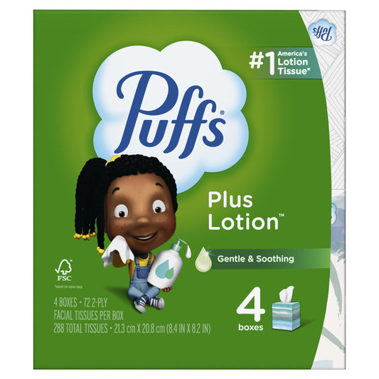 Puffs Plus Lotion Facial Tissue, 4 Mega Cube Boxes, 72 Tissues per Box