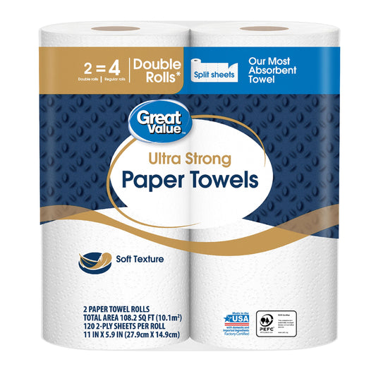 Great Value Ultra Strong Paper Towels, Split Sheets, 2 Triple Rolls