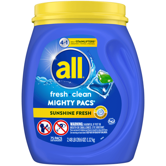 all Mighty Pacs Laundry Detergent Pacs, Fresh Clean 4 in 1 with Stainlifters, Sunshine Fresh, 75 Count