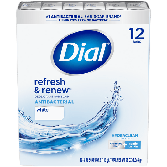 Dial Antibacterial Bar Soap, Refresh & Renew, White, 4 oz, 12 Bars